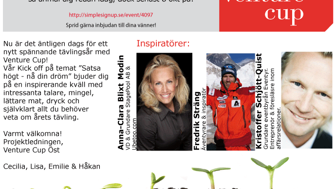 Nu är det äntligen dags för ett nytt spännande tävlingsår med Venture Cup! Vår Kick off på temat ”Satsa högt - nå din dröm” bjuder dig på en inspirerande kväll med intressanta talare, mingel, lättare mat, dryck och självklart allt du behöver veta om årets tävling.