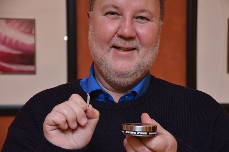 — Jag satt i tandläkarstolen och svettades för några år sedan. Jag hade då fått en elefanthudsliknande grop i munslemhinnan, synnerligen irriterat tandkött som skadats samt stor smärta av svidandet och brännandet vid snusplaceringsstället. Tandläkaren beordrade mig genast att sluta snusa. Istället fick jag en snilleblixt och klippte till ett plåster som jag placerade på snusportionens ena långsida och sedan placerade jag den skyddade sidan mot tandköttet. Smärtan upphörde genast. Sen fortsatte jag genom att bl.a. gå över till kirurgtejp och till slut den färdigutvecklade lösningen som bygger på att ett helt ofarligt, ogenomträngligt och tunt membran (0,025 mm) som i snustillverkningsprocessen innefattas på insidan av snusportionens ena långsida. Sedan några år konstaterar min tandläkare att min mun är helt frisk igen trots att jag nu snusat i 40 år, säger Bengt Wiberg.