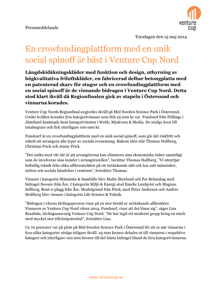 ”Bidragen i vårens tävlingsprocess visar på en stor bredd av nytänkande affärsidéer. Vinnaren av Venture Cup Nord våren 2014, Fundsurf, visar att det lönar sig”, säger Lisa Braafnäs, tävlingsansvarig Venture Cup Nord. ”De har tagit ett modernt grepp kring en nisch med mycket stor tillväxtpotential”, fortsätter Lisa.