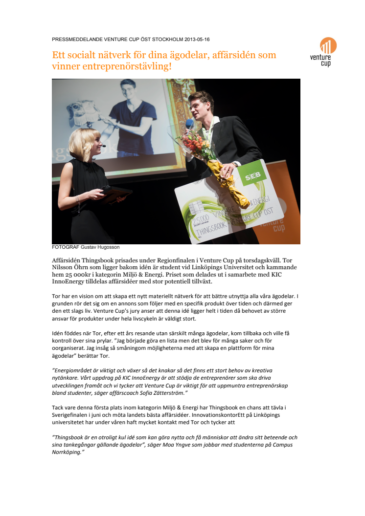 Affärsidén Thingsbook prisades under Regionfinalen i Venture Cup på torsdagskväll. Tor Nilsson Öhrn som ligger bakom idén är student vid Linköpings Universitet och kammande hem 25 000kr i kategorin Miljö & Energi. Priset som delades ut i samarbete med KIC InnoEnergy tilldelas affärsidéer med stor potentiell tillväxt.