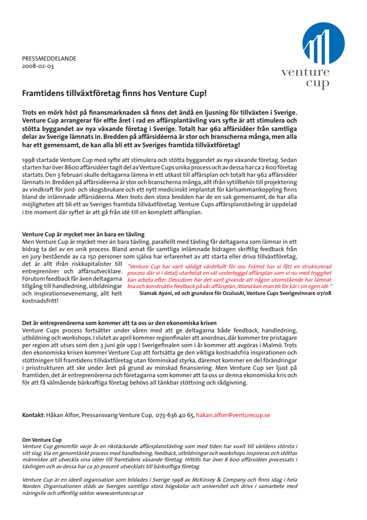 "Venture Cup har varit väldigt värdefullt för oss. Främst har vi fått en strukturerad process där vi i detalj utarbetat en väl underbyggd affärsplan som vi nu med trygghet kan arbeta efter. Dessutom har det varit givande att någon utomstående har lämnat bra och konstruktiv feedback på vår affärsplan, ibland kan man bli för kär i sin egen idé " Siamak Ayani, vd och grundare för OculusAI, Venture Cups Sverigevinnare 07/08