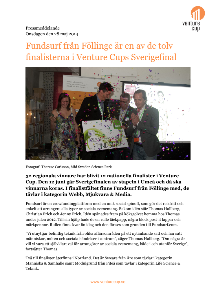 32 regionala vinnare har blivit 12 nationella finalister i Venture Cup. Den 12 juni går Sverigefinalen av stapeln i Umeå och då ska vinnarna koras. I finalistfältet finns Fundsurf från Föllinge med, de tävlar i kategorin Webb, Mjukvara & Media.