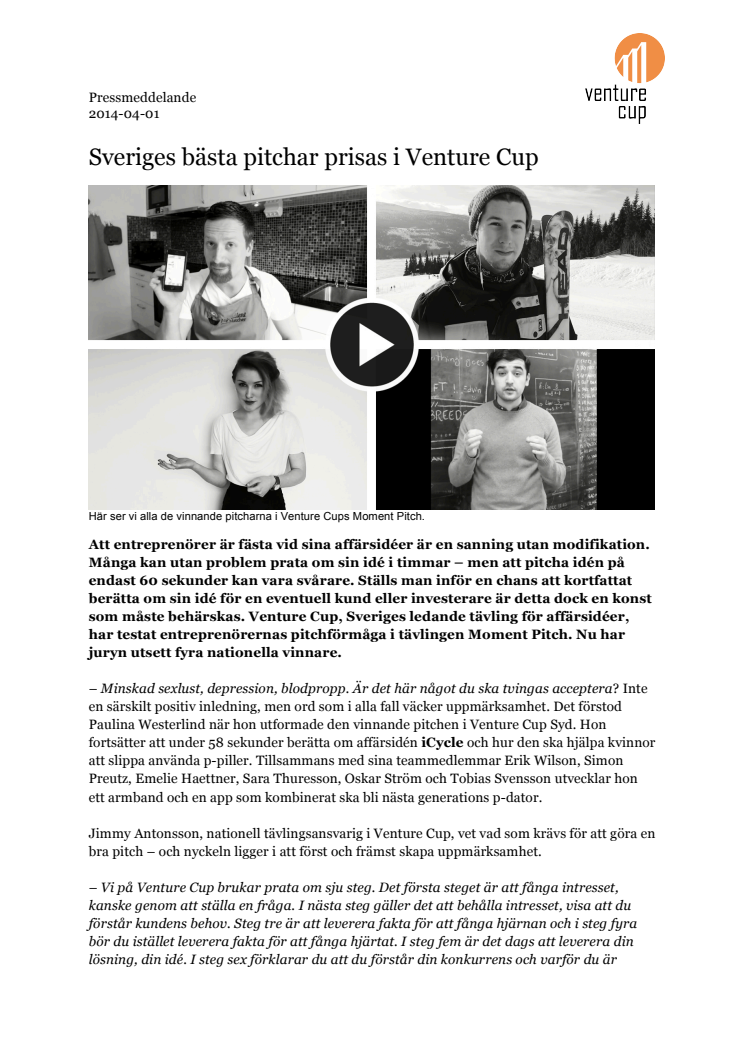 Att entreprenörer är fästa vid sina affärsidéer är en sanning utan modifikation. Många kan utan problem prata om sin idé i timmar, men att pitcha idén på endast 60 sekunder kan vara svårare. Ställs man inför en chans att kortfattat berätta om sin idé för en eventuell kund eller investerare är detta dock en konst som måste behärskas. Venture Cup, Sveriges ledande tävling för affärsidéer, har testat entreprenörernas pitchförmåga i tävlingen Moment Pitch. Nu har juryn utsett fyra nationella vinnare.