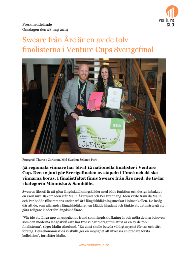 32 regionala vinnare har blivit 12 nationella finalister i Venture Cup. Den 12 juni går Sverigefinalen av stapeln i Umeå och då ska vinnarna koras. I finalistfältet finns Sweare från Åre med, de tävlar i kategorin Människa & Samhälle.