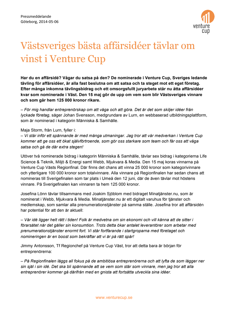 nominerade i Venture Cup, Sveriges ledande tävling för affärsidéer, är alla fast