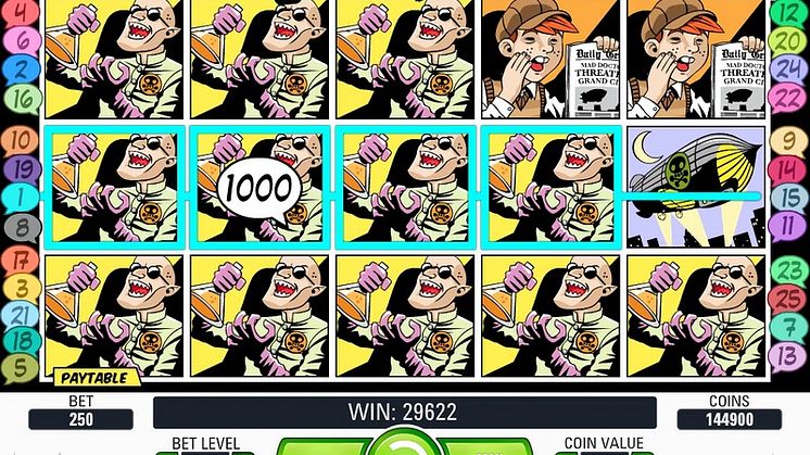 Detta spel har en riktig serietidningskänsla som ger en en rolig, aningen barnslig men mycket nervkittlande upplevelse. Spelets speciella features är otroliga! De 15 fristående hjulen snurrar individuellt vilket bereder väg för så många fler olika och roliga vinstkombinationer. Med 5 bilder på diagonalen som visar Jack Hammer vinner du 250,000 mynt!