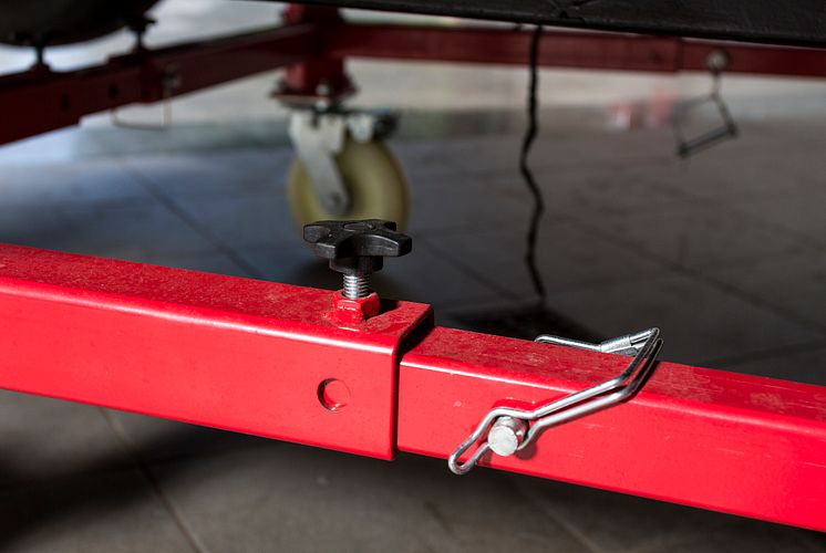 Bild 3. Pela karosserivagn för smidigare renovering. Vagnen har fyra kullagrade hjul med broms samt gummiklädda lyftkuddar med trapetsskruv som gör det enkelt att justera höjden.