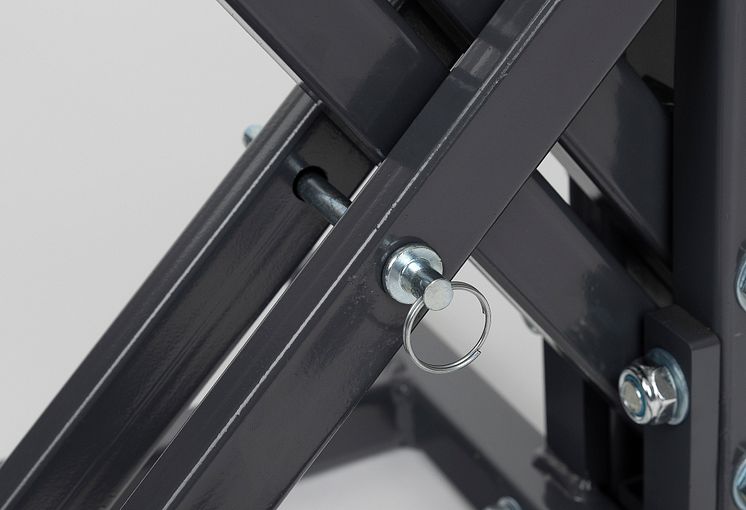 Både höj- och sänkning sker med handtag. Lyften säkerhetsspärras med medföljande sprint vid 630 mm arbetshöjd, vilket även avlastar hydrauliken och förlänger livslängd. Plattformens storlek: 44x35 cm. Minsta höjd 160 mm. Total storlek 98x50 cm (exklusive pumphandtag). Max. vikt: 150 kg.