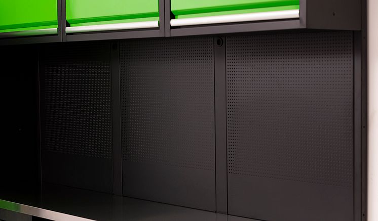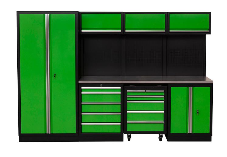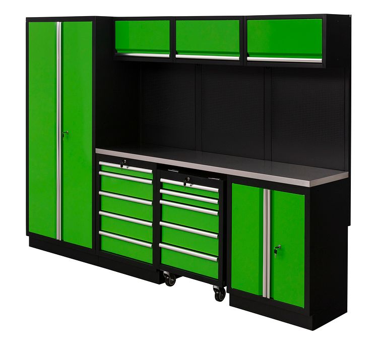 Komplett garageinredning med verktygsvagn i grön- och svartlackerat utförande. Skåp av helsvetsad konstruktion som enkelt monteras ihop till en stabil modul. Mängd praktiska skåp, lådor och utrymmen för förvaring och upphängning av dina verktyg med tillbehör till garaget. Medföljande bänkskiva av rostfritt stål ger dig en både tålig, snygg och framförallt välkomnande arbetsyta. Modulen innehåller dessutom en verktygsvagn på hjul som vid behov enkelt kan rullas fram närmare arbetsområdet, samtidigt stuvas undan till sin plats när mer utrymme krävs. Medföljande verktygstavlor är kompatibla med PELA's sortiment av verktygskrokar och tillbehör. Högskåpet kan placeras valfri sida av inredningen.