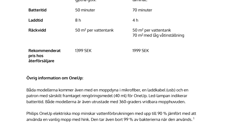 Designen är avskalad och kommer i två modeller: 3000- och 5000 serien. OneUp använder ett inbyggt autodoserande rengöringsmedel som räcker till 40 sessioner och motsvarar tre flaskor vanligt rengöringsmedel. Moppdynorna är tillverkade i mjuk mikrofiber som kan användas på alla hårda golv och är maskintvättbara. En tank räcker till att moppa 50 m2. Rekommenderat pris hos återförsäljare ligger på 1399 kr för 3000 serien och 1999 kr för 5000 serien. Finns att köpa hos Elgiganten, Clas Ohlson samt i Philips egna webbshop.
