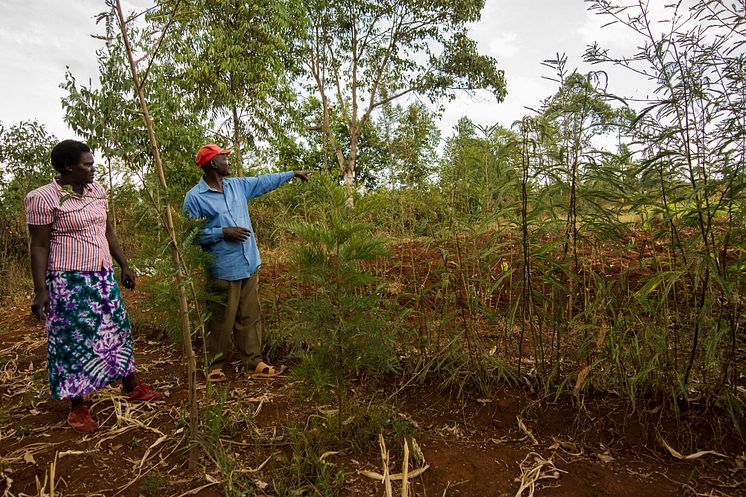 Paret Benta Muga och John Oruko ett exempel på att det kan gå snabbt att anpassa sig till klimatförändringarna. För tre år sedan gick paret Vi-skogens utbildning i agroforestry , att kombinera trädplantering och odling av grödor på sin gård. Bilden visar deras gård år 2 efter att de börjat plantera träd. I det tropiska klimatet kan träden växa åtskilliga meter varje år.