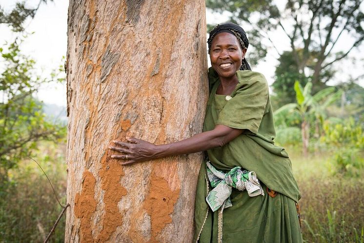 Bildtext: Francis Nakitto, 60 år, bor i byn Kiteza i centrala Uganda och berättar att det tidigare var svårt att få lyckade skördar och att kunna försörja sin familj. Från Vi-skogen har hon fått kunskap om trädplantering och hur vi tillsammans kan bekämpa klimatförändringar. ”Det här trädet (på bilden) är det första jag planterade när jag kom i kontakt med Vi-skogen. Jag minns hur de först kom till vår by – nu har trädet stått här i 25 år.