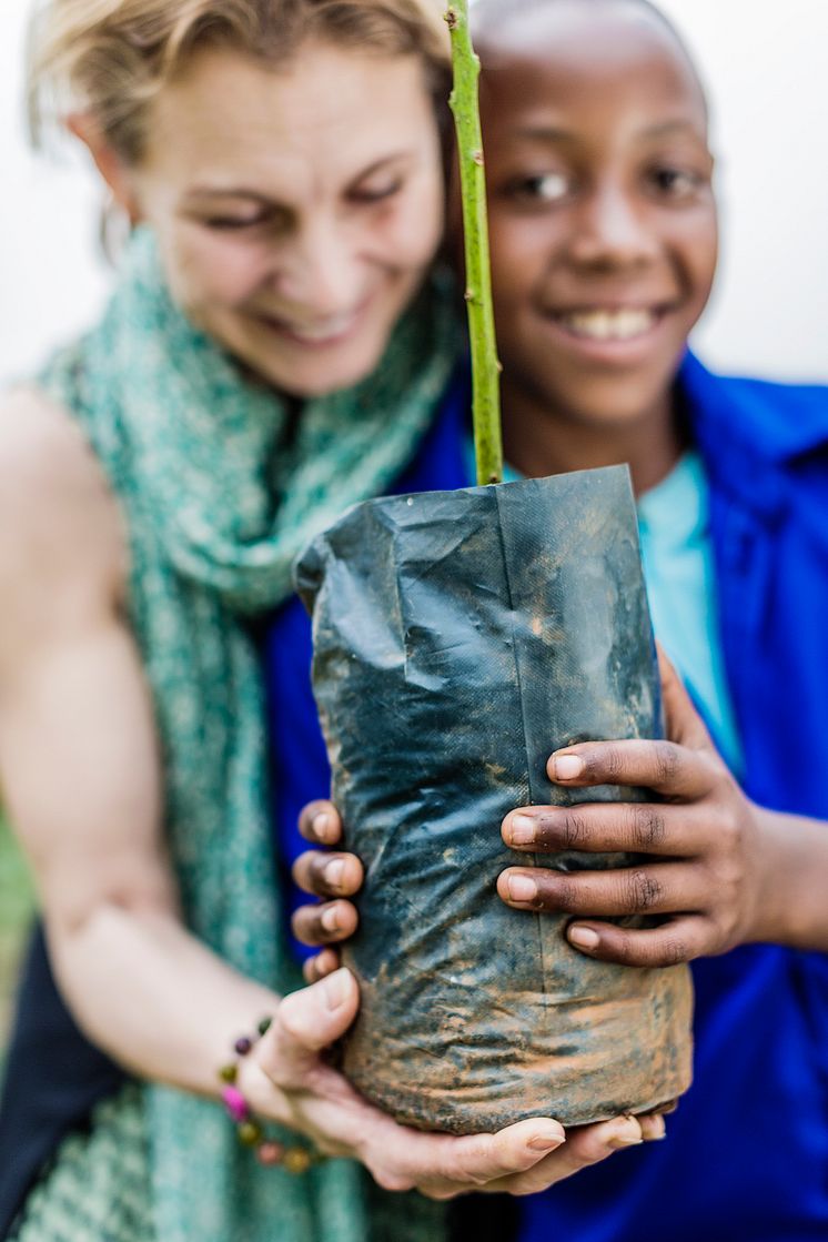 Jolie Usanzituze och Helen Sjöholm hjälptes åt att plantera en calliandra på Kininshyaskolans gård. Inom några år kommer calliandran att vara fem meter hög och ge skugga åt barnen på skolgården. Skolans bönodling kommer också att få glädje av trädet - calliandran binder livsviktigt kväve i marken som gör att bönrankorna växer bättre och ger större skörd.