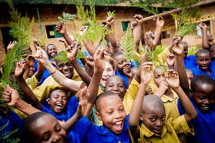 Helen Sjöholm tillsammans med en del av eleverna i skolans trädklubb, där alla elever som vill varje vecka under ledning av en lärare pratar om miljön, klimatet och trädens vikt.