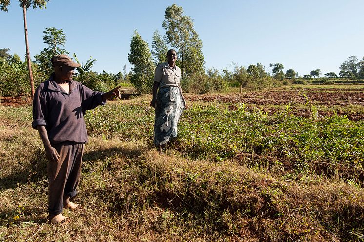 Paret Benta Muga och John Oruko visar upp sin åker innan de börjat tillämpa agroforestry. Som så många andra bönder i afrikanska länder vittnar de om att det varmare klimatet redan gett längre perioder av torka. Att allt hårdare regn förstör grödorna och spolar bort jorden på åkrarna. Att det blivit ännu tuffare att försörja sig, ställa mat på bordet och ge barnen möjlighet att gå i skolan.