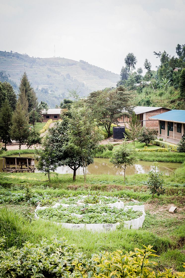 Utsikt över skolan Kininshya i Rwanda där Vi-skogen stödjer barnen att ta upp kampen mot klimatet. I förgrunden syns den köksträdgård som anlagts av lärare och barn. Skörden från köksträdgården ger ett litet men viktigt energitillskott för barnen. Många barn tar med sig kunskaperna hem till sina föräldrar, som i de flesta fall är bönder.
