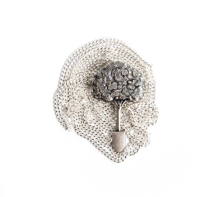 Vackert silversmycke i trädform designat av Lasse Åberg och tillverkat av silversmeden Wolfgang Gessl. 40 cm långt, berlocken är 2,5 cm. Pris: 650 kr per smycke. Tio träd planteras per smycke.