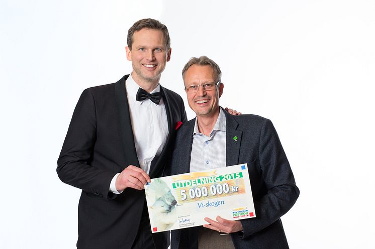 Henrik Brundin, senior advisor på Vi-skogen, mottog igår en check på fem miljoner kronor från PostkodLotteriets Rickard Sjöberg.