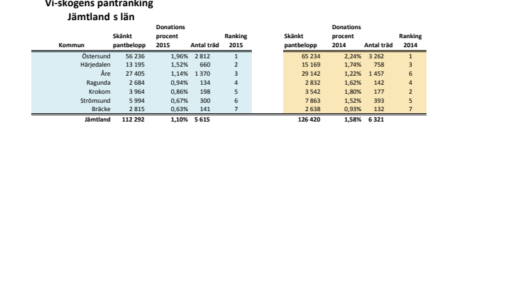 Mest givmilda med panten i Jämtland är Östersundsborna, där skänker invånarna i snitt 1,96 kronor av varje pantad 100-lapp via Biståndsknappen. De behåller därmed sin guldmedalj i länet. Härjedalen avancerar och är nu näst mest givmilda i länet. Trea kommer Åre, som klättrar från en sjätteplats. Hela rankningen för Jämtlands län bifogas som en PDF.