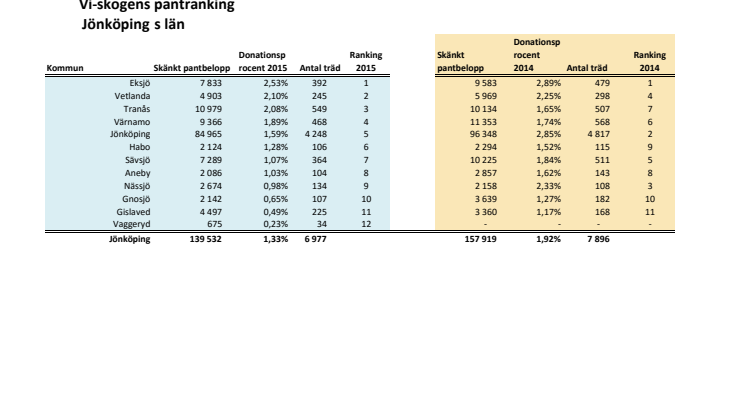 I Jönköpings län gavs sammanlagt 139 532 pantkronor via Biståndsknappen under 2015, vilket motsvarar 6 977 träd i Vi-skogen, som är förmånstagare för Biståndsknappen.