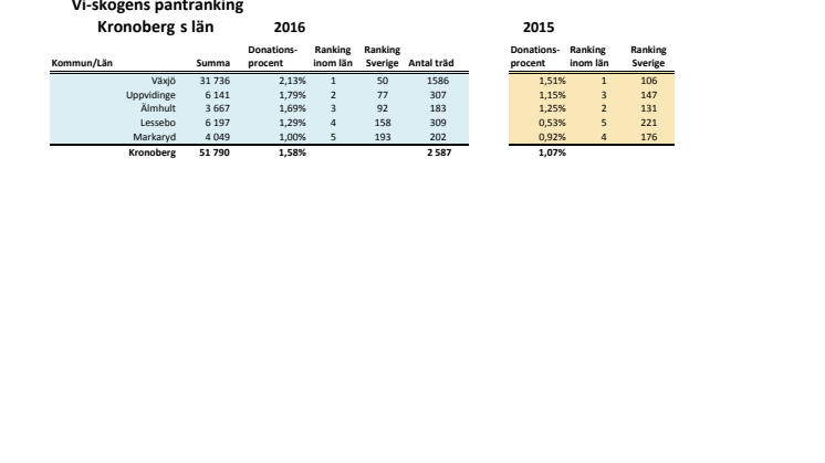 Kronobergsborna gav sammanlagt 51 790 pantkronor via Biståndsknappen under 2016. Det motsvarar 2 587 träd i Vi-skogen, som är förmånstagare för Biståndsknappen.