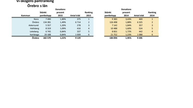 Mest givmilda med panten i Örebro län är Noraborna. Där skänker invånarna i snitt 1,89 kronor av varje pantad 100-lapp via Biståndsknappen. De behåller därmed sin förstaplats i Vi-skogens pantrankningen. På andra plats kommer Örebro kommun, följt av Askersund. Hela rankningen för Örebro län bifogas som en PDF.