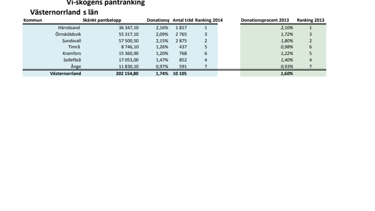 I Västernorrland skänktes under förra året 202 154 pantkronor till bistånd i Coops butiker. Totalt skänktes 8,1 miljoner kronor via Biståndsknappen under 2014. Det är nytt rekord och motsvarar över 400 000 nya träd i Afrika där Vi-skogen arbetar. I snitt skänkte svensken bort 2,2 kronor av varje pantad 100-lapp under 2014. Det är en 14-procentig ökning från året före då snittet var 1,93 kronor.
