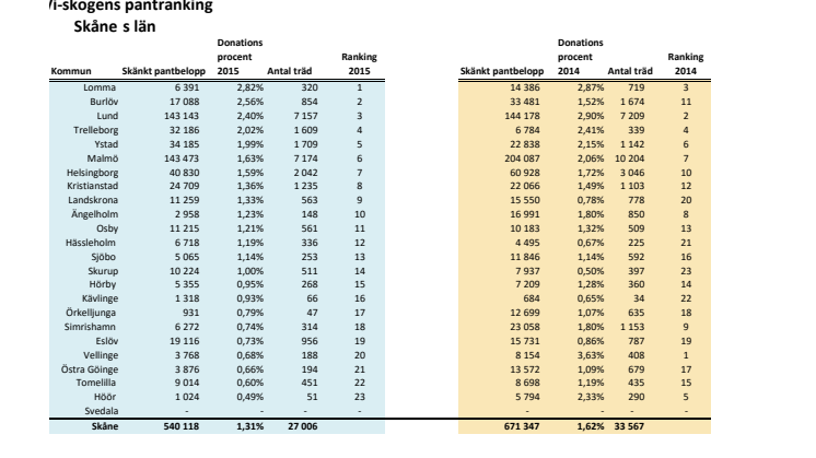 Mest givmilda med pantpengarna i Skåne är invånarna i Lomma. Tillsammans skänkte skåningarna 540 118 pantkronor under 2015, motsvarande 27 006 nya träd i Afrika. Det visar Vi-skogens årliga pantrankning av Biståndsknappen hos Coop. TOPPLISTOR NEDAN.
