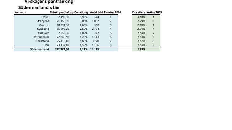 Bästa kommun i länet är Trosa där invånarna i snitt skänker 3,96 kronor av varje pantad hundralapp via Biståndsknappen. Snittet ger en tolfteplats i landet. Tvåa i länet är Strängnäs som därmed petar ned Gnesta till en tredje plats. Därefter kommer Nyköping respektive Vingåker. FULLSTÄNDIG LÄNSRANKNING BIFOGAS.