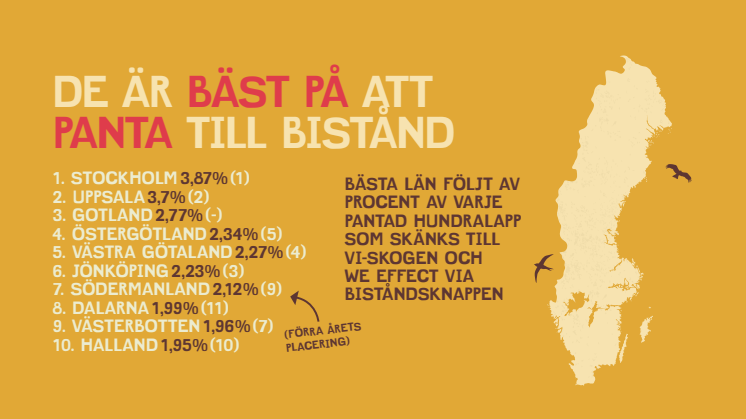 Topplistor – bästa kommun/län följt av procent av varje pantad hundralapp som skänks till Vi-skogen och We Effect via Biståndsknappen: