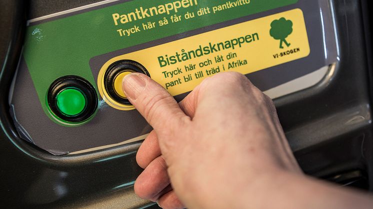 Den som pantar burkar eller flaskor i en av Coops butiker kan välja att trycka på Biståndsknappen och skänka pantpengarna till Vi-skogen. Totalt skänktes pant till ett värde av över 6,9 miljoner kronor hos Coop under 2020. Pantpengarna från 2020 motsvarar mer än 345 000 nya träd i östra Afrika, där Vi-skogen arbetar.