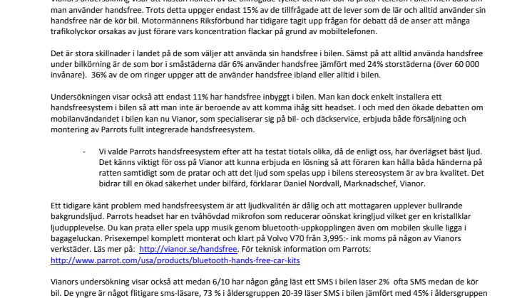 Undersökningen visar också att endast 11% har handsfree inbyggt i bilen. Man kan dock enkelt installera ett handsfreesystem i bilen så att man inte är beroende av att komma ihåg sitt headset. I och med den ökade debatten om mobilanvändandet i bilen kan nu Vianor, som specialiserar sig på bil‐ och däckservice, erbjuda både försäljning och montering av Parrots fullt integrerade handsfreesystem.