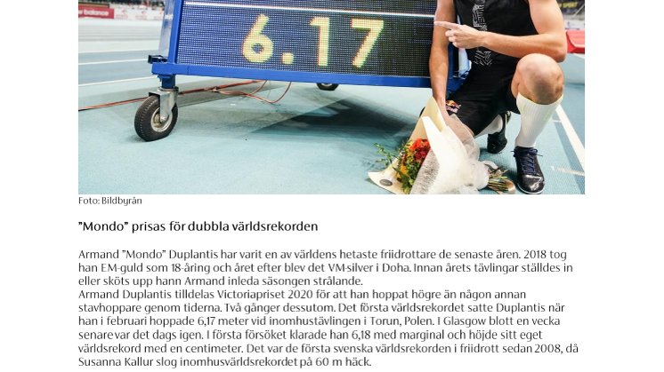 Armand Duplantis tilldelas Victoriapriset 2020 för att han hoppat högre än någon annan stavhoppare genom tiderna. Två gånger dessutom. Det första världsrekordet satte Duplantis när han i februari hoppade 6,17 meter vid inomhustävlingen i Torun, Polen. I Glasgow blott en vecka senare var det dags igen. I första försöket klarade han 6,18 med marginal och höjde sitt eget världsrekord med en centimeter. Det var de första svenska världsrekorden i friidrott sedan 2008, då Susanna Kallur slog inomhusvärldsrekordet på 60 m häck.