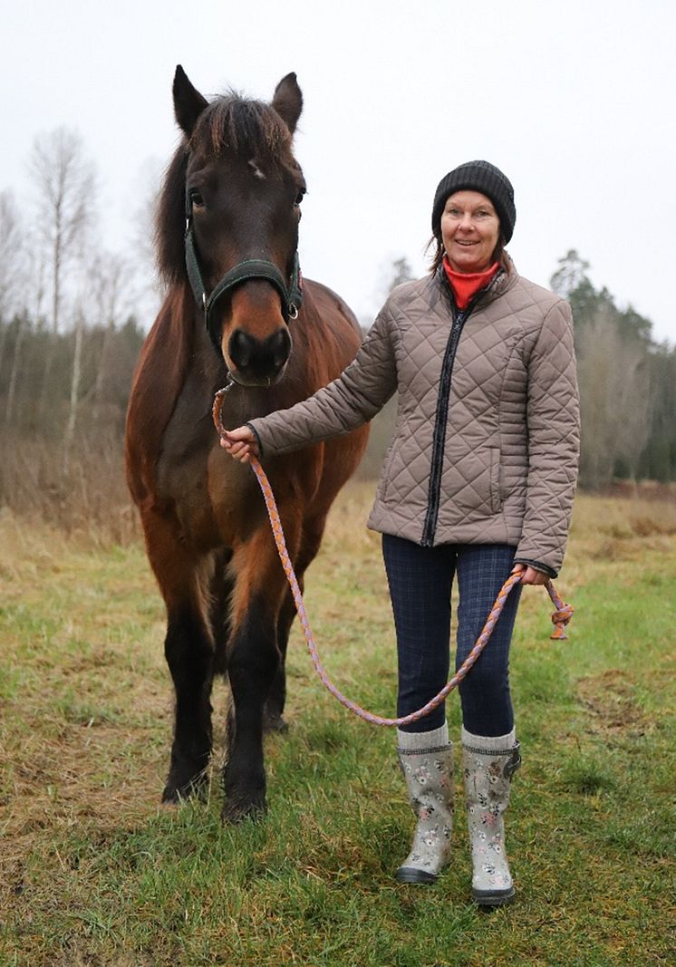 Anette Vilhelmsson, ordförande i Svenska Hästars Värn, tillsammans med Oskar.