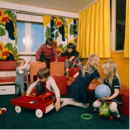 Under det färgglada 1970-talet körde de allra minsta omkring med sparkbilar omgivna av tidsenligt Marimekkomönster och man öppnade de första bollhaven. Skeppskatten Ville Viking har bott på de röda båtarna sedan 1980-talet och givetvis finns bollhavet och den välbekanta maskoten även på Viking Glory. Förutom ett lekrum har den nya båten även lokaler för unga och bl.a. en klättervägg.