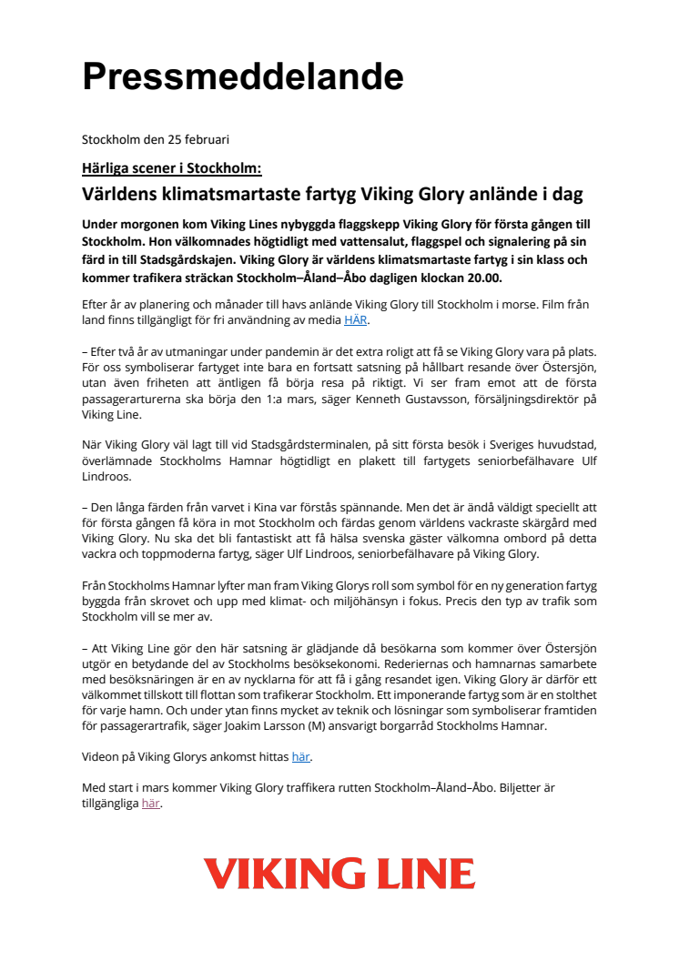 – Att Viking Line gör den här satsning är glädjande då besökarna som kommer över Östersjön utgör en betydande del av Stockholms besöksekonomi. Rederiernas och hamnarnas samarbete med besöksnäringen är en av nycklarna för att få i gång resandet igen. Viking Glory är därför ett välkommet tillskott till flottan som trafikerar Stockholm. Ett imponerande fartyg som är en stolthet för varje hamn. Och under ytan finns mycket av teknik och lösningar som symboliserar framtiden för passagerartrafik, säger Joakim Larsson (M) ansvarigt borgarråd Stockholms Hamnar.