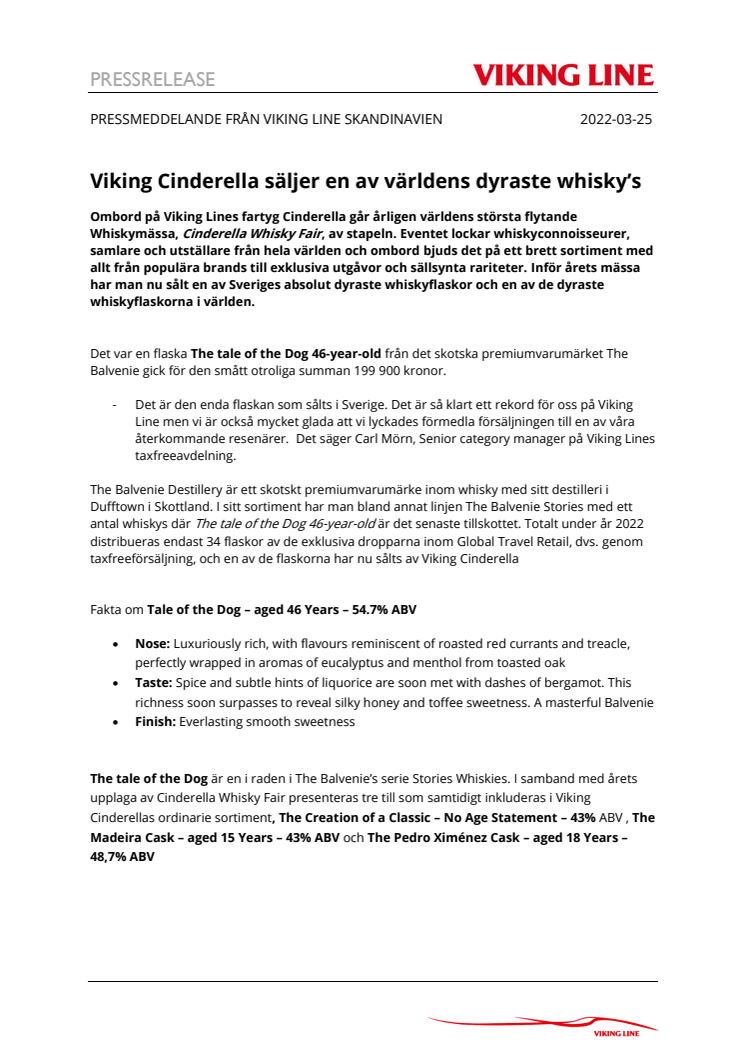 The Balvenie Destillery är ett skotskt premiumvarumärke inom whisky med sitt destilleri i Dufftown i Skottland. I sitt sortiment har man bland annat linjen The Balvenie Stories med ett antal whiskys där The tale of the Dog 46-year-oldär det senaste tillskottet. Totalt under år 2022 distribueras endast 34 flaskor av de exklusiva dropparna inom Global Travel Retail, dvs. genom taxfreeförsäljning, och en av de flaskorna har nu sålts av Viking Cinderella