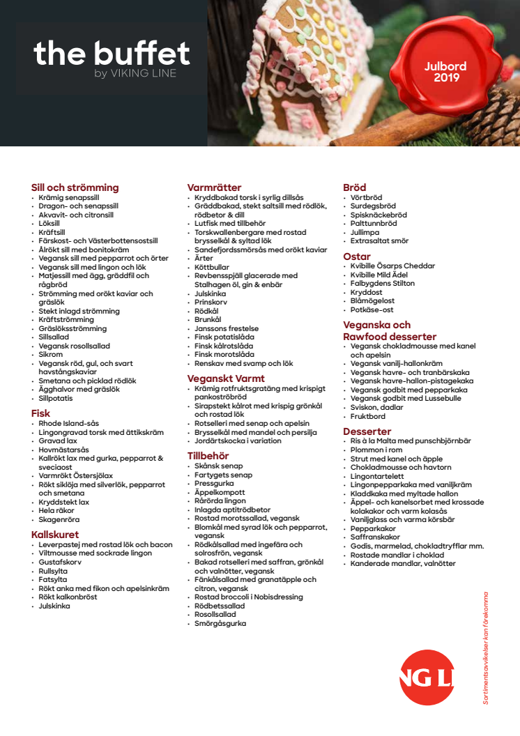 Sedan 2017 bedriver rederiet Viking Line ett långsiktigt samarbete med Svenska Kocklandslaget. Tillsammans har man vidareutvecklat buffén, serverat exklusiva avsmakningsmenyer och uppdaterat erbjudandet för konferensgästerna. Om två veckor är det dags att inleda årets julsäsong med ett julbord dignande av läckerheter. De mest älskade rätterna som skinka, sill och Janssons frestelse dukas fram tillsammans med ett brett urval av växtbaserade alternativ som varken innehåller mjölkprodukter, ägg eller ost. Exempelvis serveras vegansk lingon- och löksill, krämig rotfruktsgratäng med krispigt pankoströbröd och vegansk chokladmousse med kanel och apelsin.