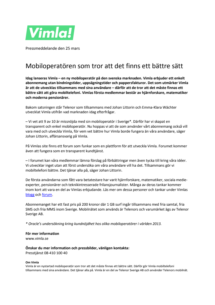 Idag lanseras Vimla – en ny mobiloperatör på den svenska marknaden. Vimla erbjuder ett enkelt abonnemang utan bindningstider, uppsägningstider och pappersfakturor. Det som utmärker Vimla är att de utvecklas tillsammans med sina användare – därför att de tror att det måste finnas ett bättre sätt att göra mobiltelefoni. Vimlas första medlemmar består av hjärnforskare, matematiker och moderna pensionärer.