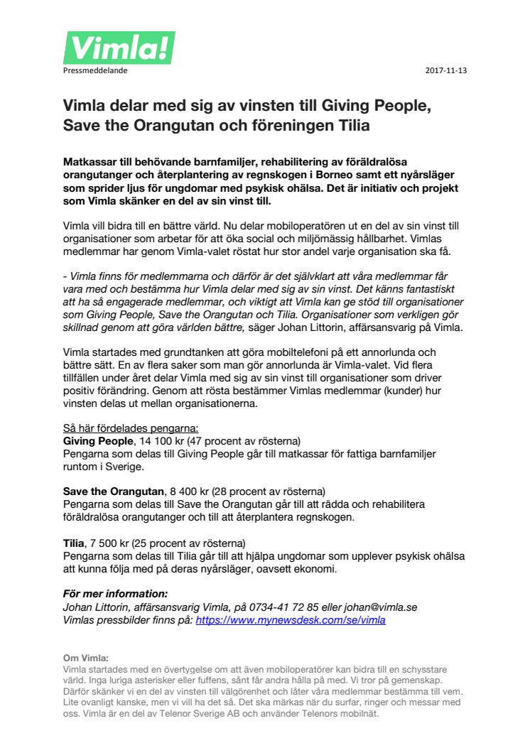 - Vimla finns för medlemmarna och därför är det självklart att våra medlemmar får vara med och bestämma hur Vimla delar med sig av sin vinst. Det känns fantastiskt att ha så engagerade medlemmar, och viktigt att Vimla kan ge stöd till organisationer som Giving People, Save the Orangutan och Tilia. Organisationer som verkligen gör skillnad genom att göra världen bättre, säger Johan Littorin, affärsansvarig på Vimla.