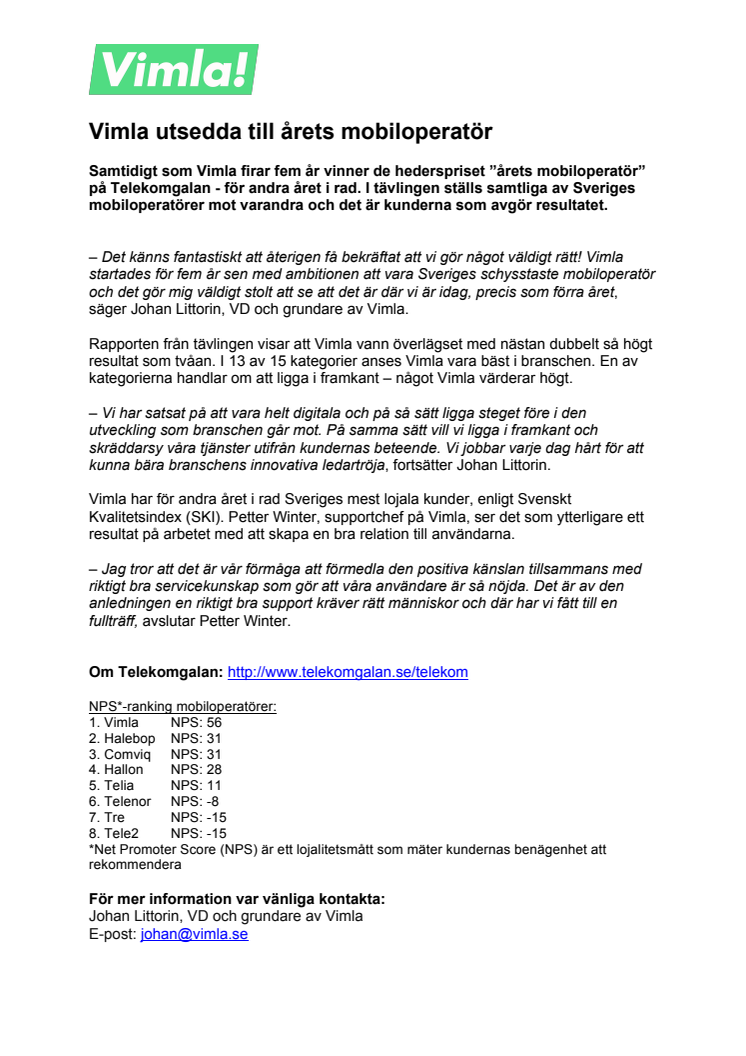 – Det känns fantastiskt att återigen få bekräftat att vi gör något väldigt rätt! Vimla startades för fem år sen med ambitionen att vara Sveriges schysstaste mobiloperatör och det gör mig väldigt stolt att se att det är där vi är idag, precis som förra året, säger Johan Littorin, VD och grundare av Vimla.