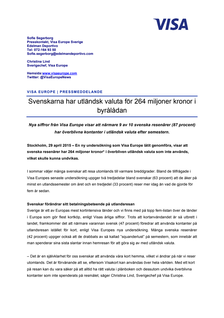 Nya siffror från Visa Europe visar att närmare 9 av 10 svenska resenärer (87 procent) har överblivna kontanter i utländsk valuta efter semestern.