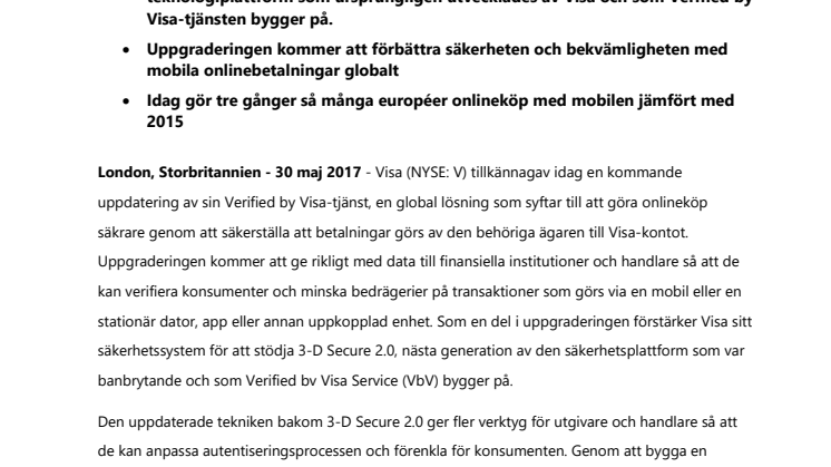 London, Storbritannien - 30 maj 2017 - Visa (NYSE: V) tillkännagav idag en kommande uppdatering av sin Verified by Visa-tjänst, en global lösning som syftar till att göra onlineköp säkrare genom att säkerställa att betalningar görs av den behöriga ägaren till Visa-kontot.