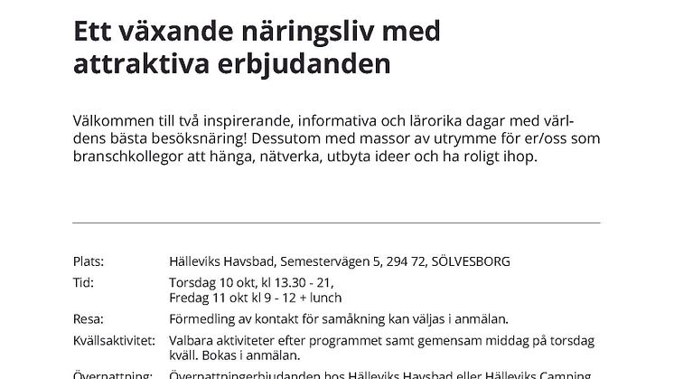 Den 10-11 oktober arrangeras årets branschträff för besöksnäringen i Blekinge med fokus på att skapa ett växande näringsliv och utveckla attraktiva erbjudanden. Under två halvdagar kommer företagare och aktörer inom regionens besöksnäring att mötas för inspiration, kunskapsutbyte och nätverkande, med målet att tillsammans skapa en starkare och mer konkurrenskraftig näring.