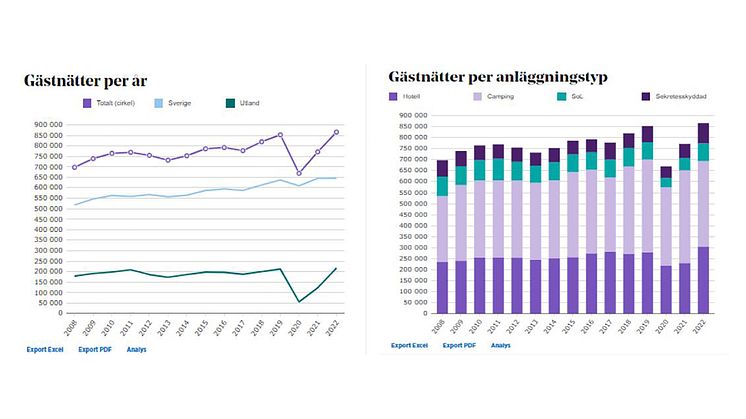 Alla siffror från Tillväxtverket är under innestående år preliminära, då det emellanåt kan röra sig om en hel del eftersläpning för vissa månader. Enligt den prognos vi satte i maj förväntas vi nå 1 050 000 gästnätter för hela 2022. Detta baserar vi framför allt på starkare säsonger utanför högsäsong och en återvändande internationell marknad. Detta skulle kunna innebära rekord och utifrån perioden jan-aug så håller vi onekligen rekordfart. Om det blir rekord för hela året eller ej kan vi dock först bekräfta 2023.
