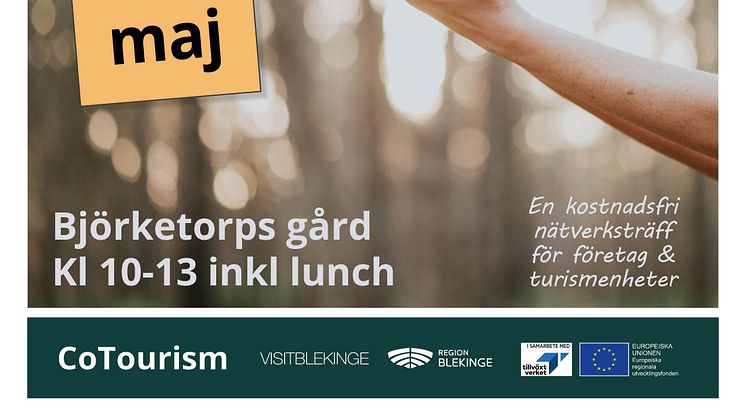 Välkommen till årets kick-off inför högsäsongen för Blekinges besöksnäring! Över 60 företagare och branschkollegor från den offentliga sektorn möts för att prata om satsningar, utmaningar och hur vi tillsammans samverkar och utvecklas. I en utställningsdel delar deltagarna med sig av eget material och tar del av andras. I talarprogrammet finns bl. a. Blekingetrafiken, ARK56, Lantbrukarnas riksförbund och Visit Blekinge – alla på plats för att berätta om rykande färska samarbeten och kampanjer. Eventet arrangeras genom ERUF-projektet CoTourism som stöttar Blekinges besöksnäring i pandemin.