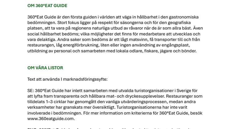 360°Eat Guide tilldelar restauranger 1–3 cirklar baserat på deras hållbarhetsarbete, tillsammans med gastronomiska poäng för kulinarisk kvalitet. Nytt för i år är att 360°Eat Guide även rekommenderar bagerier, kaffebarer, pizzerior, vinbarer och andra ansvarsfulla matställen på platser där guiden redan utvärderar restauranger. För att lyfta ytterligare hållbara och transparenta mat- och dryckesupplevelser i landet har 360°Eat Guide ingått partnerskap med utvalda turistorganisationer. Turistorganisationerna har inte varit delaktiga i bedömningsprocessen.
