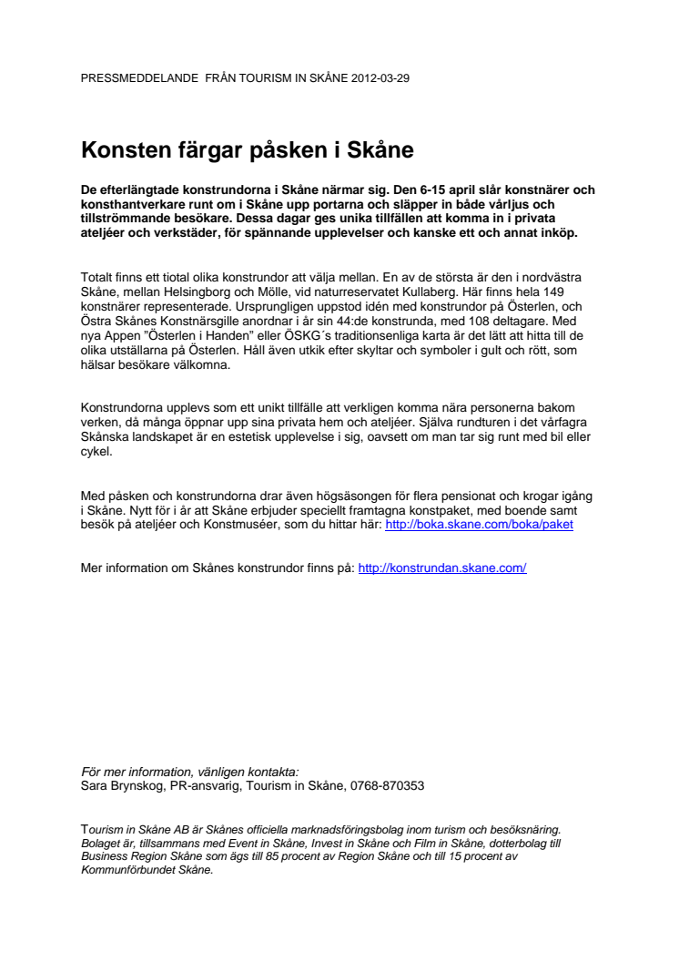 De efterlängtade konstrundorna i Skåne närmar sig. Den 6-15 april slår konstnärer och konsthantverkare runt om i Skåne upp portarna och släpper in både vårljus och tillströmmande besökare. Dessa dagar ges unika tillfällen att komma in i privata ateljéer och verkstäder, för spännande upplevelser och kanske ett och annat inköp.