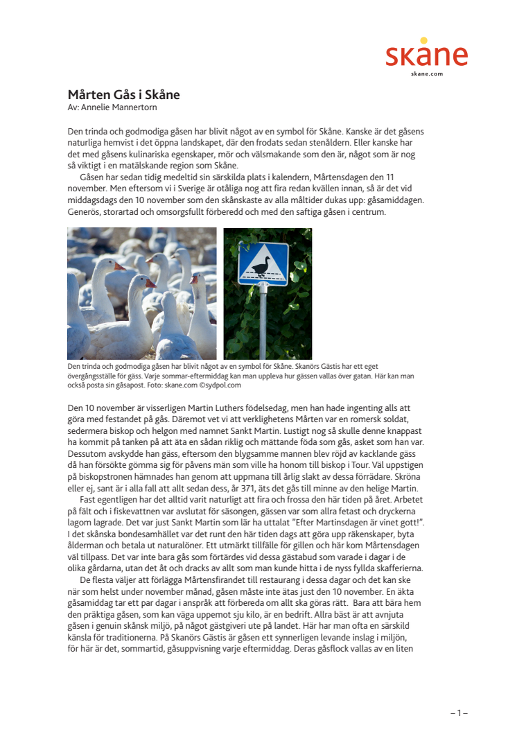 Den trinda och godmodiga gåsen har blivit något av en symbol för Skåne. Kanske är det gåsens naturliga hemvist i det öppna landskapet. Eller kanske har det med gåsens kulinariska egenskaper, mör och välsmakande som den är, något som är nog så viktigt i en matälskande region som Skåne. Läs och inspireras av Annelie Mannertorns artikel om denna kulinariska upplevelse. (Fri för publicering).