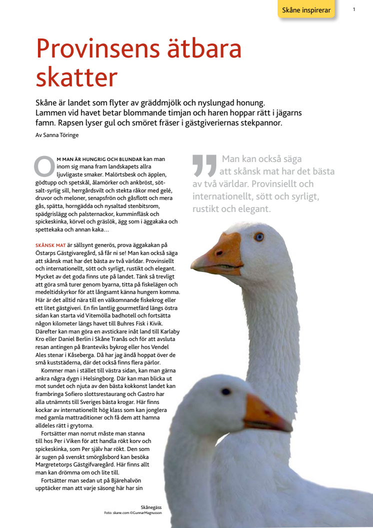 Skåne är landet som flyter av gräddmjölk och nyslungad honung. Lammen vid havet betar blommande timjan och haren hoppar rätt i jägarns famn. Rapsen lyser gul och smöret fräser i gästgiveriernas stekpannor. Sanna Töringe är utbildad bibliotekarie, författare och journalist och bor på Österlen. Hon har skrivit ett tiotal böcker, bland annat om trädgård och mat. Läs hennes artikel om skånsk mat